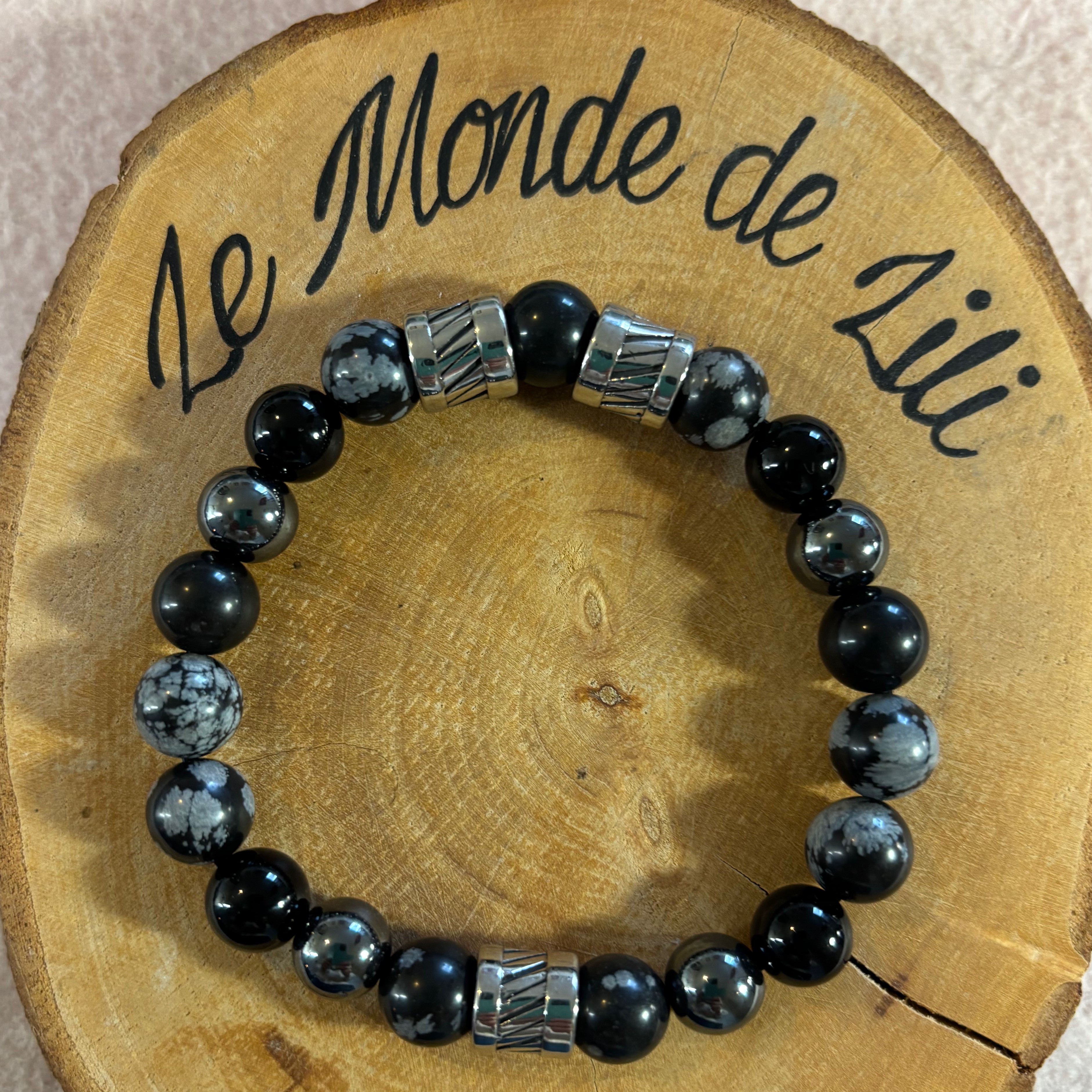 Hématite, onyx, obsidienne flocon de neige et acier inoxydable.