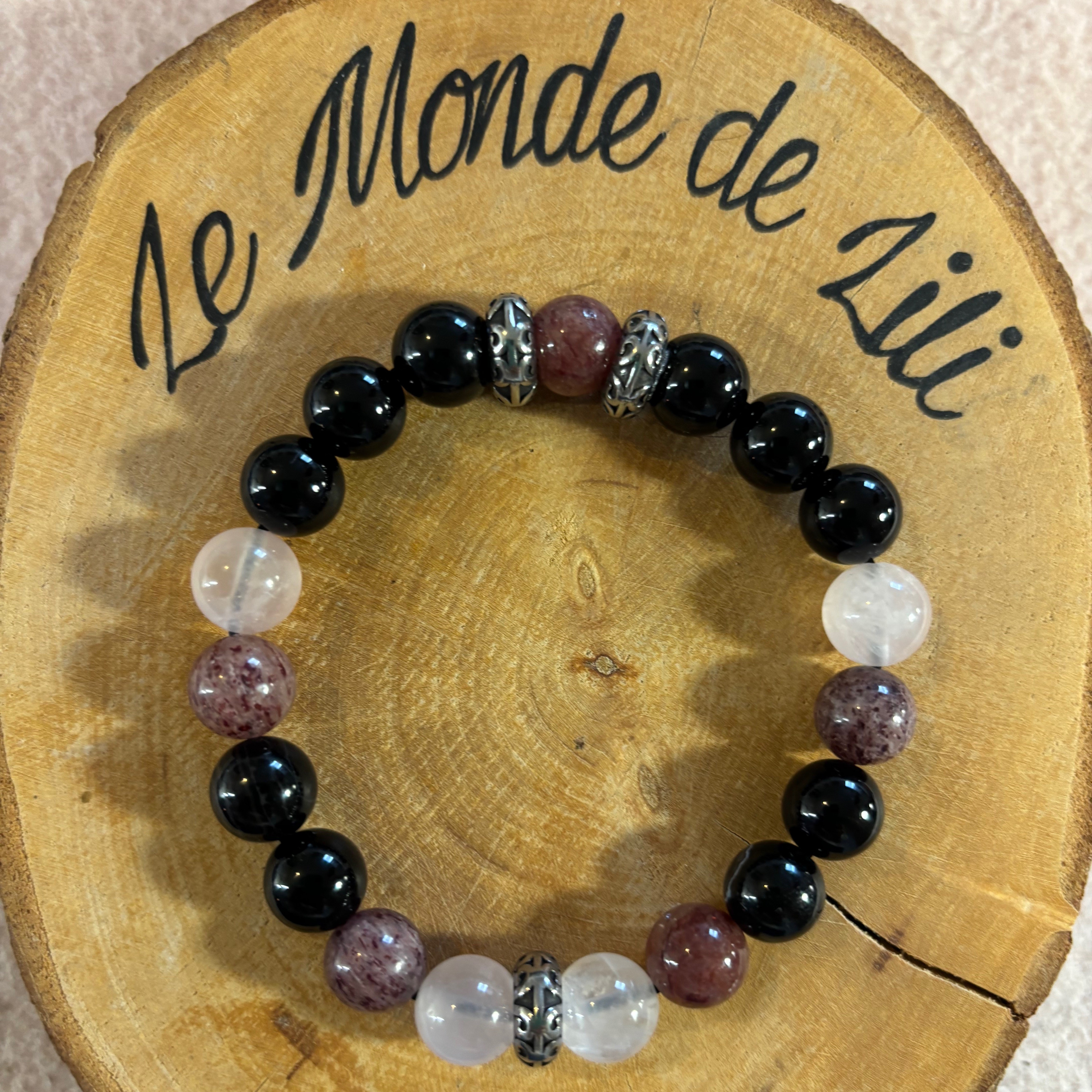 Onyx, quartz rose, quartz fraise et acier inoxydable.