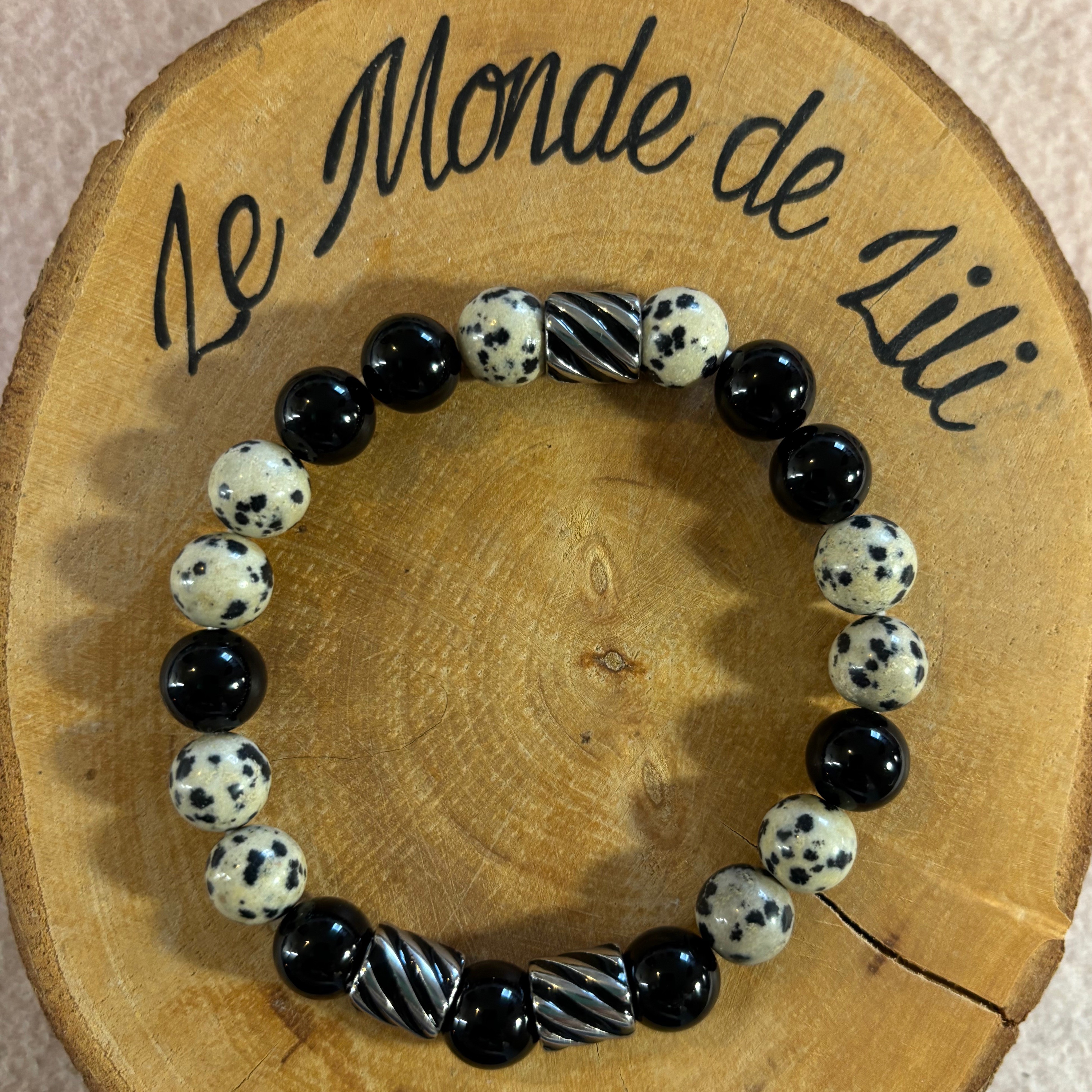 Agate noire, jaspe dalmatien et acier inoxydable.