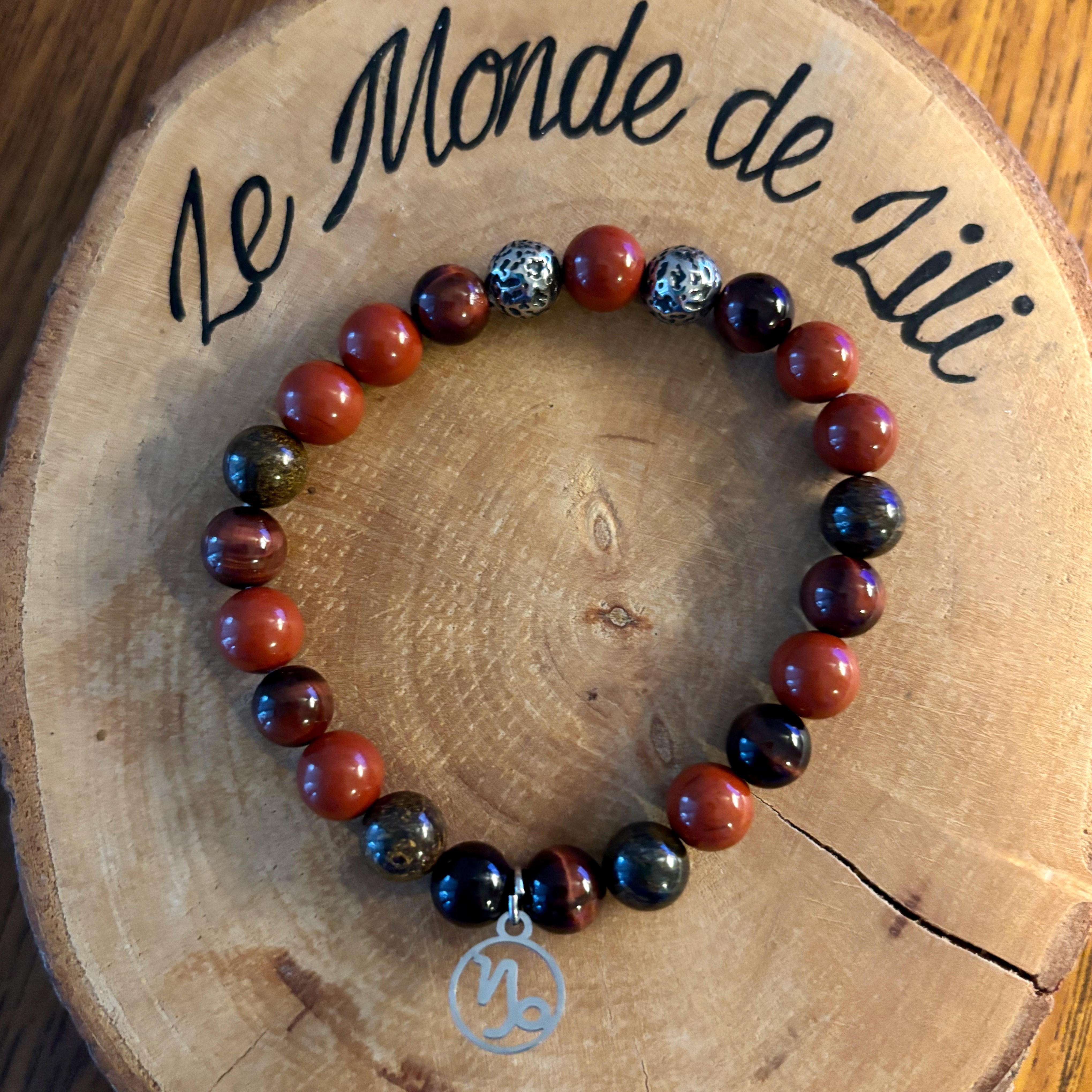 Jaspe rouge, bronzite, oeil de taureau et acier inoxydable.
