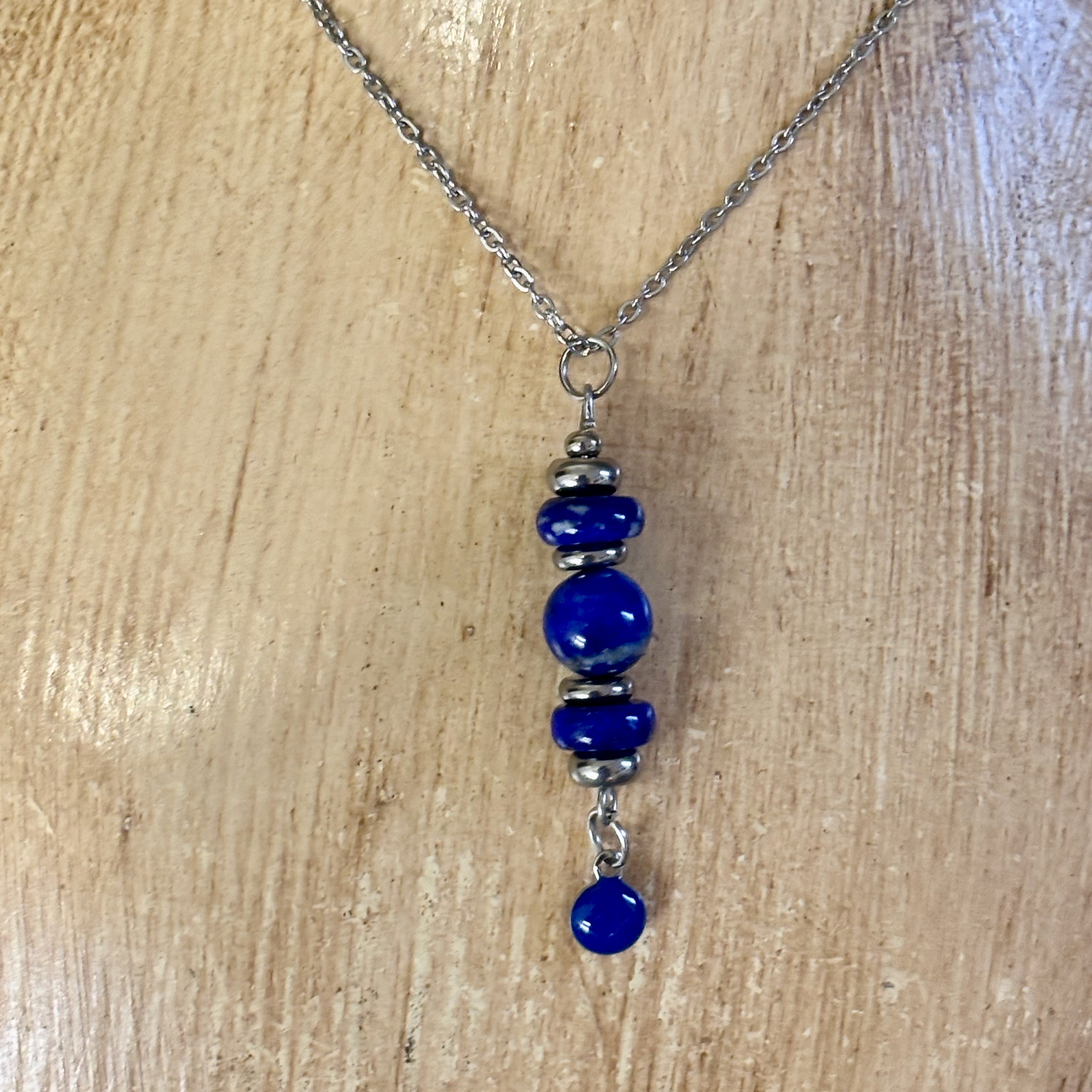 Chaine en acier inoxydable et pendentif en lapis lazuli et acier inoxydable.