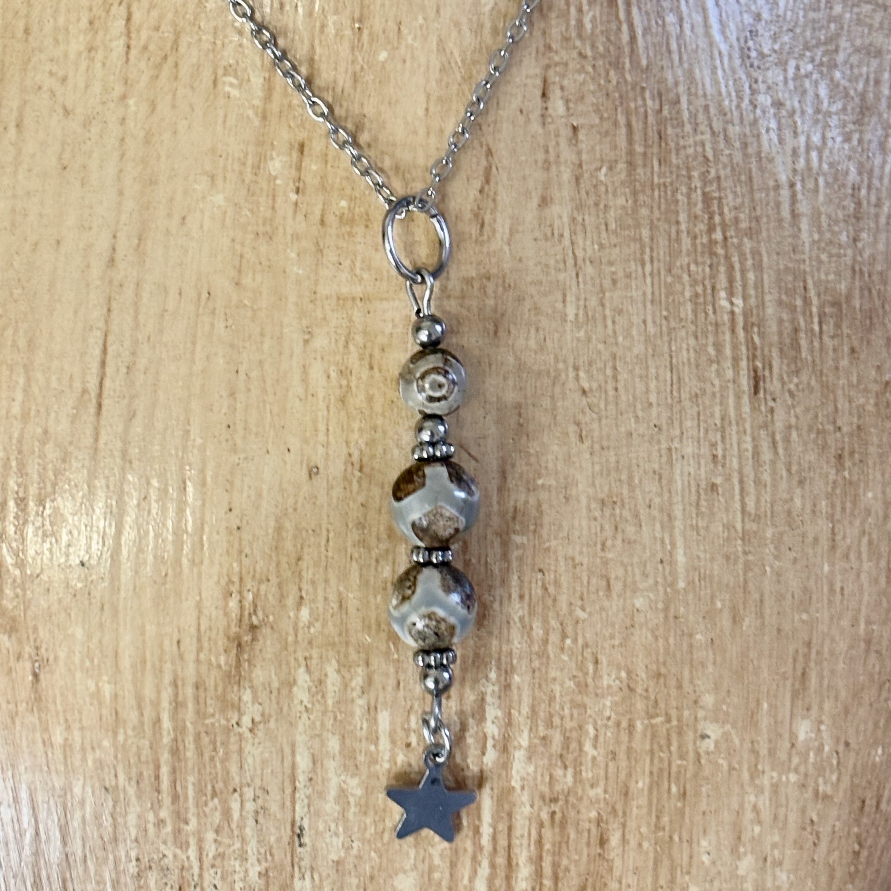Chaine en acier inoxydable et pendentif en agate Dzi et acier inoxydable.