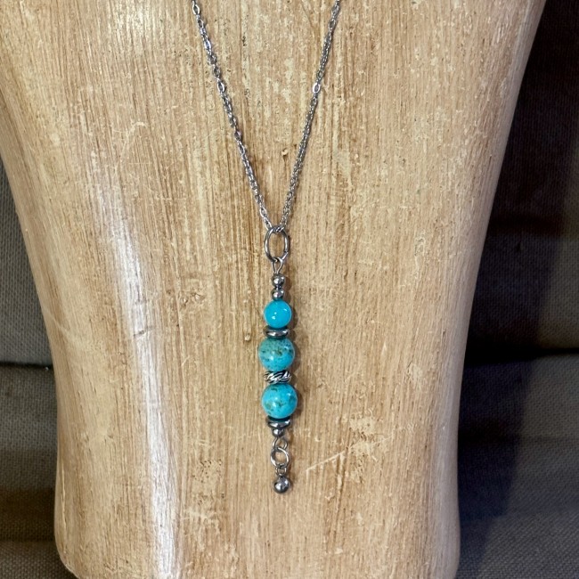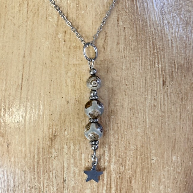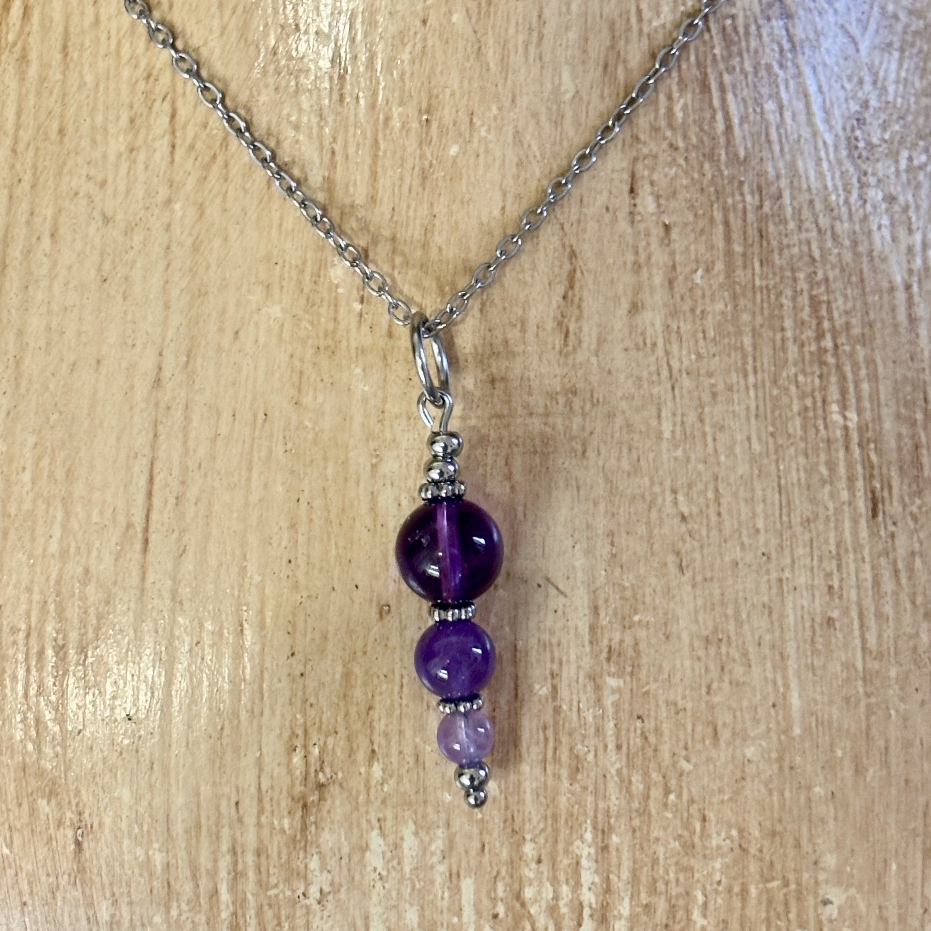 Chaine en acier inoxydable et pendentif en améthiste et acier inoxydable.
